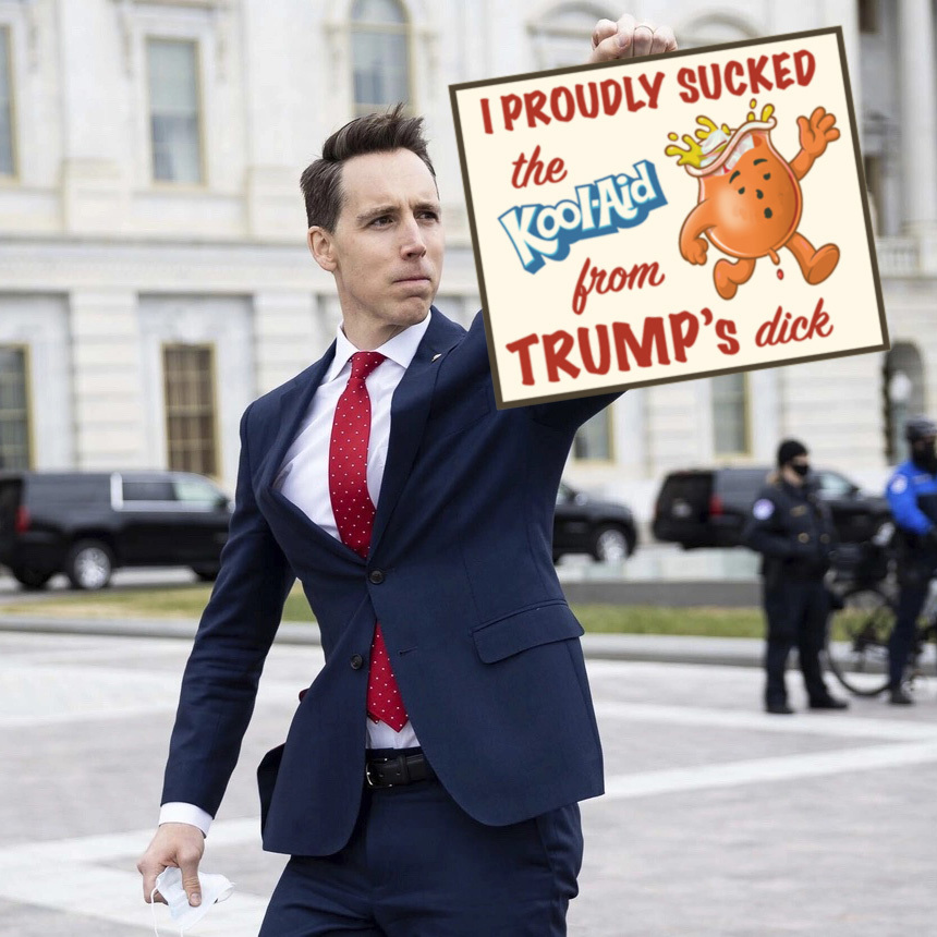 Yet another fauxto has emerged of yet another proud Kool-Aid Kid. This time it's Josh Hawley proudly declaring to the crowd on Insurrection Day that he is willing to "Bend the Knee to DJT". Such fealty to a leader would be admirable if the leader wasn't an evil orange idiot.