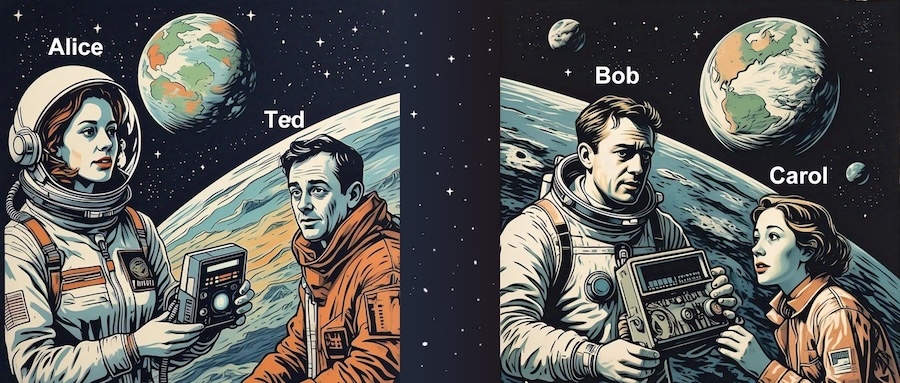 Alice and Ted with one particle while Bob and Carol have their's at a distant location