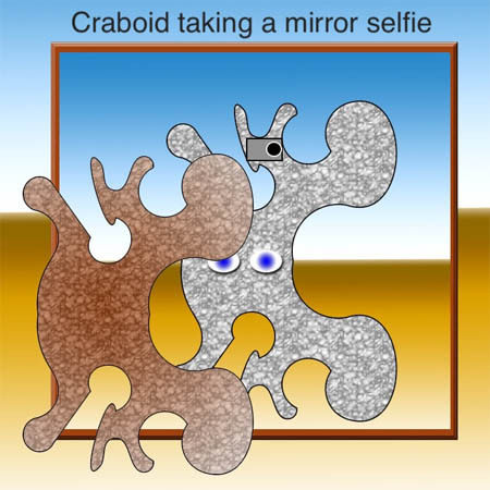 The reason we might think that our reflection is flipped from side to side but not from top to bottom is because we are bilaterally symmetrical. This is side to side or vertical symmetry, if we are standing. If we were symmetric from top to bottom (horizontal symmetry) like the Craboids of Beta Cancri D we would see that the image appears flipped top to bottom but not side to side. Our lower locomotion and tunnelling pseudopods would appear up in the air, and our upper manipulo-reproductive pseudopods would appear on the ground.