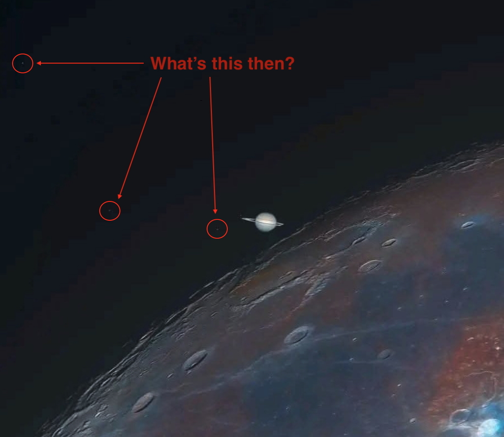When this picture by Andrew McCarthy was posted on Facebook, flerfs*, space deniers and other loonies claimed it was fake because Saturn was too big relative to the Moon. They also complained "where are the stars" but look at the larger image below for my reply to that.