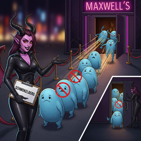 After the triumphant reception of this work on propitious possession, Quimbo took, in his words, “a Scientific sabbatical” returning to his interest in Physics to develop his challenge to both the concept of strict entropic increase, and to the traditional refutation of the “Maxwell’s Demon” strategy. This lead in turn to the alternative strategy known as “Schmokelberg’s Door Bitch”, after the affectionate name for nightclub promoter-hostess-door supervisor-bouncers.